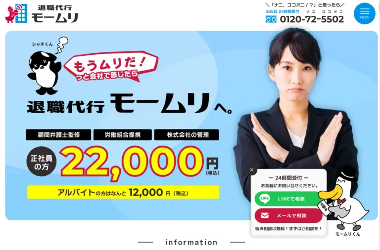 | 退職代行モームリ | ○ | 正社員22,000円(税込)、アルバイト12,000円(税込) | 民間企業(労働組合提携) |