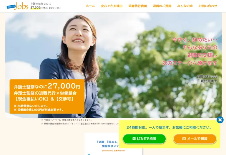 | 退職代行Jobs | ○ | 27,000円(税込)+労働組合費2,000円 | 民間企業(労働組合提携) |
